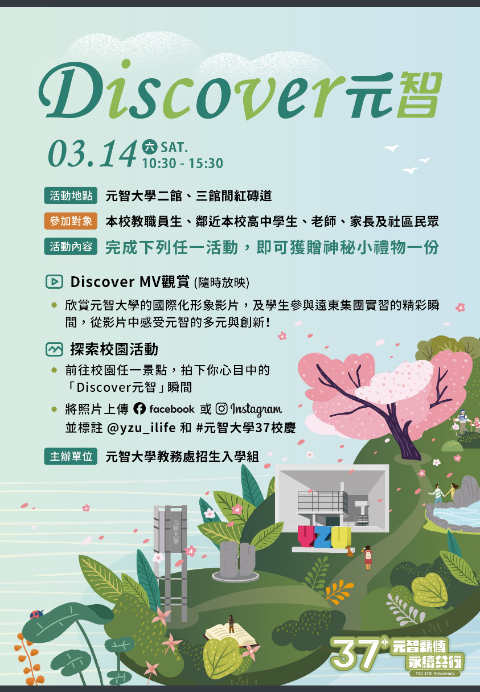 一、本校為慶祝創校37週年,特規劃「Discover 元智」校慶系列活動,透過短片觀賞及校園探索體驗,期協助高中職學生提前認識大學學習環境,作為未來升學規劃之參考,讓參與者深入認識本校國際化辦學特色及多元學習成果。