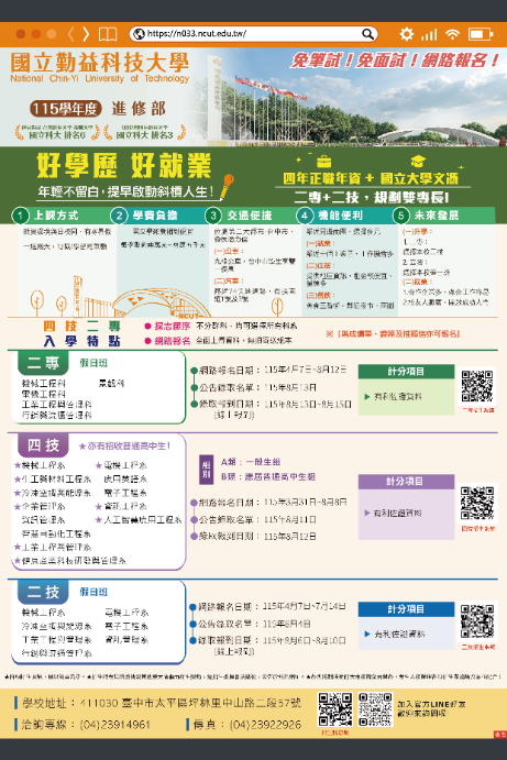 | 公告主旨 | 國立勤益科技大學115學年度二專進修部(假日班)及二技進修部(假日班)獨立招生訊息 |