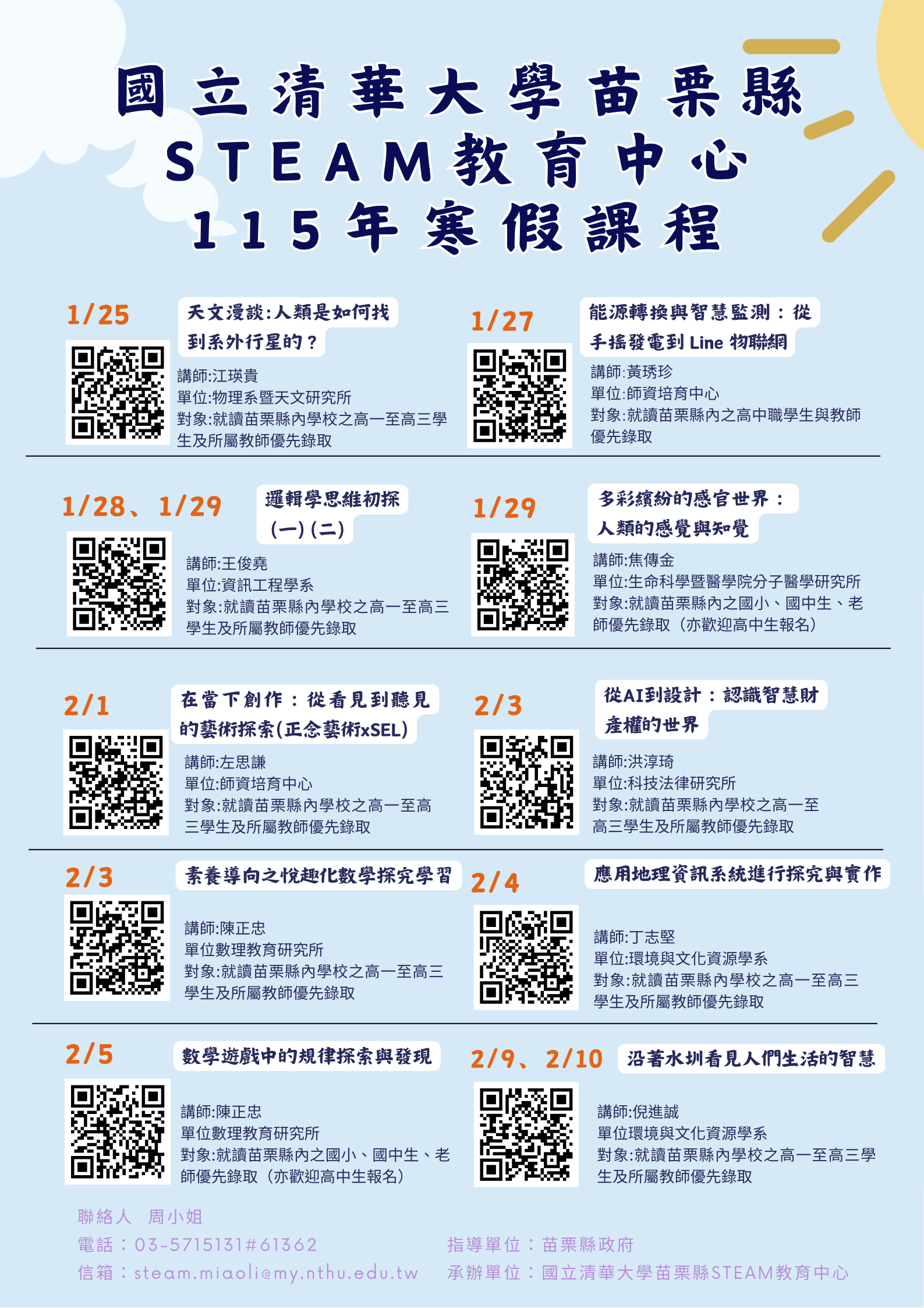 校園公布欄 公告主旨 國立清華大學苗栗縣STEAM教育中心辦理「115年寒假課程」 發布日期 2026 年 1 月 08 日 發布單位 設備組 公告類別 學生活動 公告等級 無 點閱次數 13 公告內容 國立清華大學苗栗縣STEAM教育中心辦理「115年寒假課程」,歡迎師生踴躍參與。各課程與報名資料如附件海報所示,更多資訊請掃描QRcode連結獲取。 相關附件 海報 海報 檔案名稱檔案大小檔案格式下載海報.png580.43 KB新視窗開啟檔案 海報.png 【2026-01-09】本校高一新生劉彥廷、楊宥盈同學獲頒苗栗縣114學年度優秀國中畢業生就讀本縣高中 ... 【2026-01-08】「青少年 AI 程式設計先修推廣計畫」線上課程
