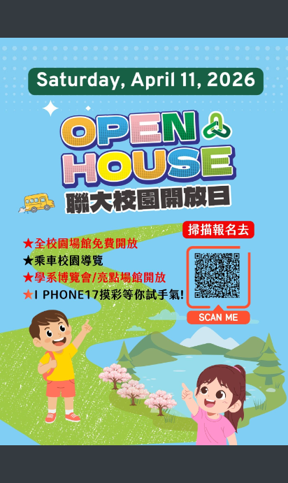 說明: 一、為協助高中職學生瞭解大學校系特色與未來發展方向,本校特辦理「OPEN HOUSE聯大校園開放日」活動。 二、活動時間:115年4月11日(六)上午9時至下午16時。 三、活動地點:國立聯合大學八甲校區圖書館前中軸道。 四、參與對象:全國各高中職學生、師長及家長。 五、活動內容包含: (一)各院系特色攤位展示。 (二)校園參訪與導覽解說。 (三)闖關集章活動與抽獎。 (四)校級單位聯合諮詢服務(招生、住宿、獎助學金等)。 六、檢送報名資訊(附件一)及活動海報(附件二),敬請協助公告並鼓勵學生踴躍參與,各校如有30人以上團體參訪需求,歡迎事先聯繫,將安排專車接送服務。 |