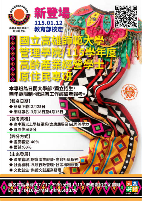 | 公告主旨 | 國立高雄師範大學115學年度「高齡產業經營學士原住民專班」招生資訊 |