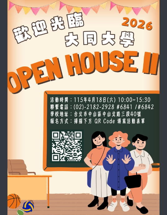 說明: 一、本校位於台北市,鄰近花博園區,交通便捷,深耕產學合作,培育務實致用人才。配合政府私校學費補助再加碼「公益興學獎學金」,學生一年共可獲得5萬元學雜費之補助,相當於公立大學收費,得以減輕學生就學負擔。 二、為使貴校師生能深入認識本校學系特色,並協助一階通過考生與家長了解各學系二階甄試注意事項,挹注學生選填適合學系,精準規劃大學生涯發展,本校舉辦「歡迎光臨大同大學OPEN HOUSE II」,活動當天校園及全學系皆開放參觀。各學系提供2個參觀時段,安排了豐富多元的導覽解說、實作體驗、教學場域參觀等,歡迎貴校師生及家長蒞臨本校。 三、活動資訊: (一)活動時間:民國115年4月18日(六)10:00-15:30 (二)報名方式:請填寫報名表選擇欲參觀的學系及場次,線上報名表單:https://forms.gle/Bwsm1sirY6Jf32xm6 四、相關資訊可參考附件海報。 |