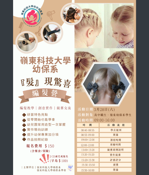 說明: 一、為強化幼兒保育相關科系學生之專業實務能力與美感素養,培養幼兒造型設計與創意表現能力,本校幼兒保育系特辦理旨揭活動。 二、本活動將於115年03月28日(星期六)上午9時至16時,假本校幼兒保育系仙庭樓1樓HT106教室舉行。 三、活動主題包括: (一)幼兒編髮基礎技巧示範與實作。 (二)創意編髮設計實務操作與成果展示。 四、參加對象為全國高級中等學校幼兒保育相關科別學生,名額30名,額滿為止;如報名人數超額,將以電腦抽籤方式錄取,並公告備取名單。 五、報名方式及相關資訊請參閱附件活動企劃書。 |