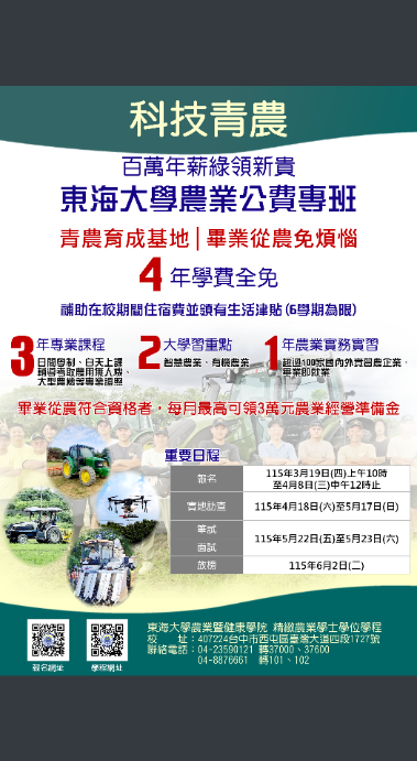 | 公告主旨 | 東海大學「115學年度精緻農業學士學位學程農業公費專班」 |
