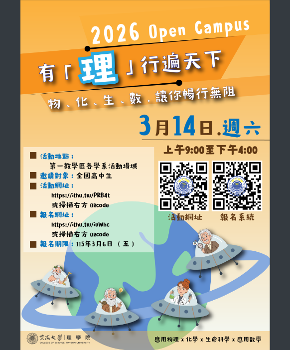 說明: 一、活動時間:115年3月14日(星期六)。 二、活動地點:本校理學院各學系實驗室。 三、報名日期:即日起至115年3月6日(星期五)止。 四、報名方式:報名連結請參閱活動海報,或登入本校報名系統(網址https://ithu.tw/iuWhc),活動內容則請參閱活動流程或登活動網頁介紹(網址https://ithu.tw/PRB4t)。 |