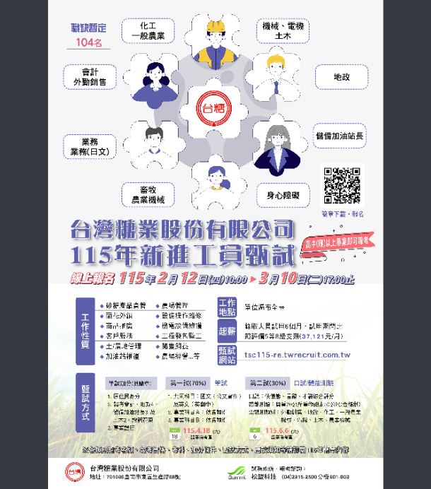 | 公告主旨 | 松盟科技股份有限公司「台灣糖業股份有限公司 115 年新進工員甄試」簡章暨甄試招考訊息 |