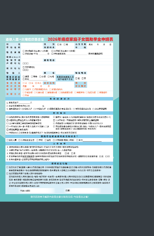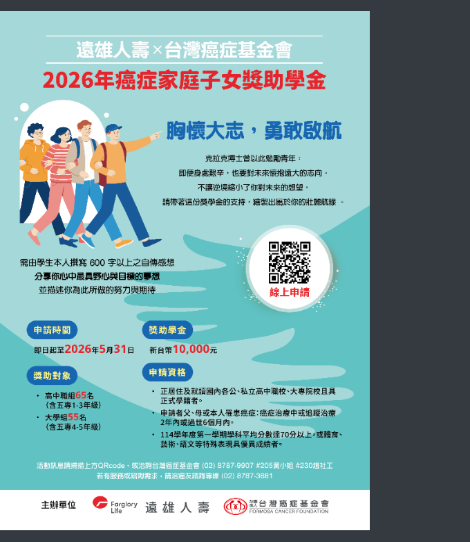 一、活動訊息: (一)報名時間:即日起至115年5月31日止 (二)獎助對象、名額、金額:高中職或大專院校之癌症家庭子女,共獎勵120名學生,經評選後每名可獲得1萬元獎助學金。 (三)獎助資格: 1、正就讀國內各公私立高中職(含大專一至三年級)、大學(含大專四至五年級),須為正式學制並具有學籍證明。 2、父、母或本人罹患癌症且目前治療中或完成治療2年內或過世6個月內。3、114學年度第一學期學科成績平均分數達70分或體育、美術等特殊表現具優異成績者。4、需檢附「學生本人撰寫之自傳感想/600字以上」及「相關證明文件」。 二、報名方式: (一)線上報名:https://scholarship.canceraway.org.tw/ (二)郵寄掛號:至台灣癌症基金會官網「最新消息」下載申請表,填寫完整連同檢附資料寄至105台北市南京東路五段16號5樓之2,並註明「2026台癌x遠雄人壽-癌症家庭子女獎助學金」 活動小組收」 |