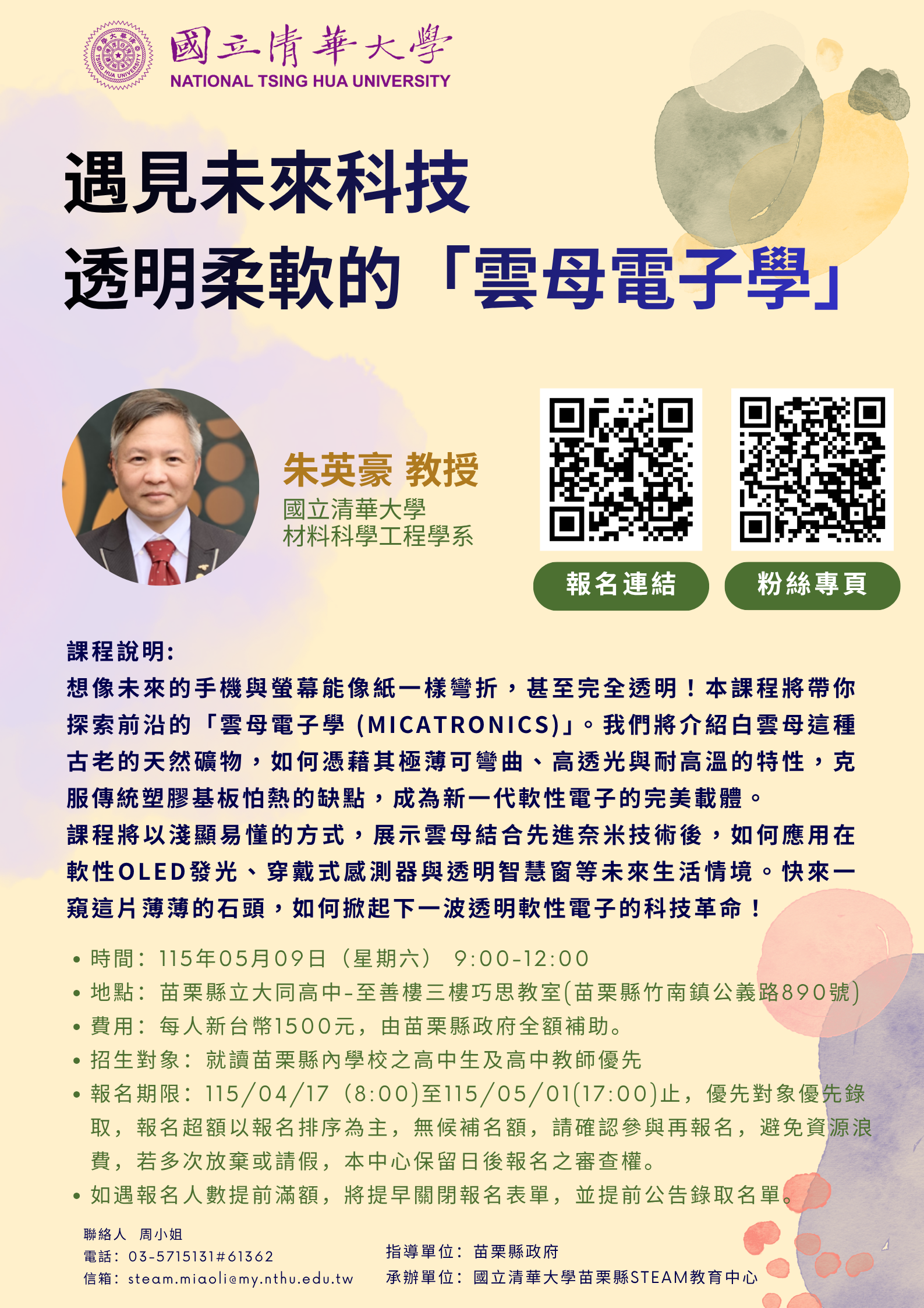 國立清華大學苗栗縣STEAM教育中心辦理「遇見未來科技-透明柔軟的『雲母電子學』主題課程。 一、本次課程以遇見未來科技-透明柔軟的「雲母電子學」為主題,由本校朱英豪(材料科學工程學系)教授指導。 二、課程簡介:想像未來的手機與螢幕能像紙一樣彎折,甚至完全透明!本課程將帶你探索前沿的「雲母電子學(MICAtronics)」。我們將介紹白雲母這種古老的天然礦物,如何憑藉其極薄可彎曲、高透光與耐高溫的特性,克服傳統塑膠基板怕熱的缺點,成為新一代軟性電子的完美載體。課程將以淺顯易懂的方式,展示雲母結合先進奈米技術後,如何應用在軟性OLED發光、穿戴式感測器與透明智慧窗等未來生活情境。快來一窺這片薄薄的石頭,如何掀起下一波透明軟性電子的科技革命! 三、課程資訊如下: (一)時間:115年5月9日(星期六)9:00-12:00。 (二)地點:苗栗縣立大同高中-至善樓三樓巧思教室(苗栗縣竹南鎮公義路890號)。 (三)費用:每人新臺幣1,500元,由苗栗縣政府全額補助。 (四)線上報名連結:https://forms.gle/iVrq4CzTUh1Nc55W6。 (五)招生對象:就讀苗栗縣內之高中生及高中教師優先。 (六)報名期限:115年4月17日(8:00)至115年5月1日(17:00),優先對象優先錄取,報名超額以報名排序為主,無候補名額,請確認參與再報名,避免資源浪費,若多次放棄或請假,國立清華大學保留日後報名之審查權。 (七)如遇報名人數提前滿額,將提早關閉報名表單,並提前公告錄取名單。 |