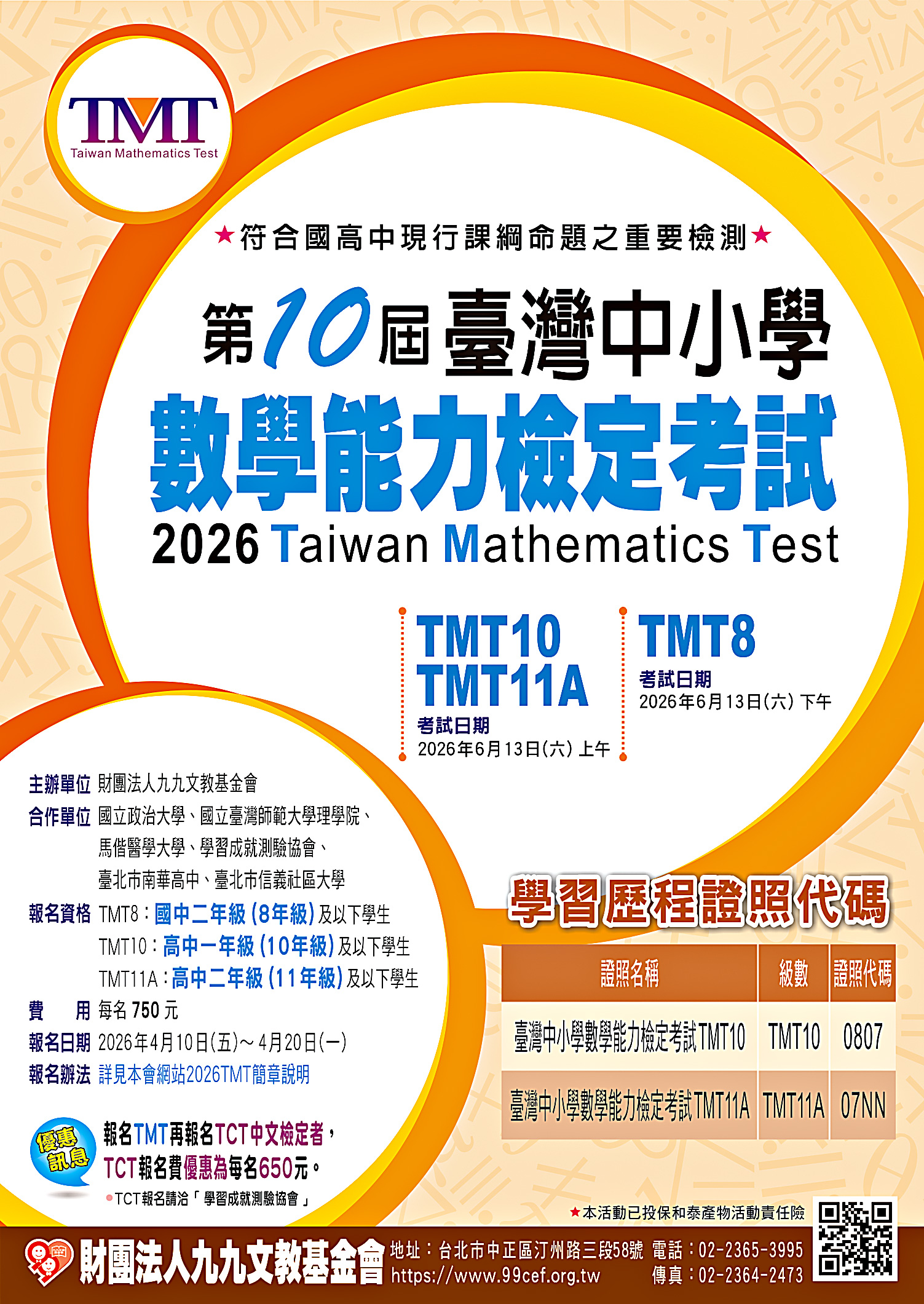 一、舉行日期:115年6月13日(星期六) 二、報名資格: (一)TMT8:全國8年級(國中二年級)以下(含)在學學生 (二)TMT10:全國10年級 (高中一年級)以下(含)在學學生 (三)TMT11A:全國11年級 (高中二年級)以下(含)在學學生 三、報名日期:115年4月10日(星期五)~115年4月20日(星期一) 四、報名方式:詳細報名訊息及相關步驟,請參閱九九文教基金會網站。 五、報名費用每名學生750元,為幫助(中)低收入戶同學,九九文教基金會將補助每名學生免收工本費參加本次測驗,計200個名額,額滿即不再受理報名。申請辦法請參閱九九文教基金會網站。 |