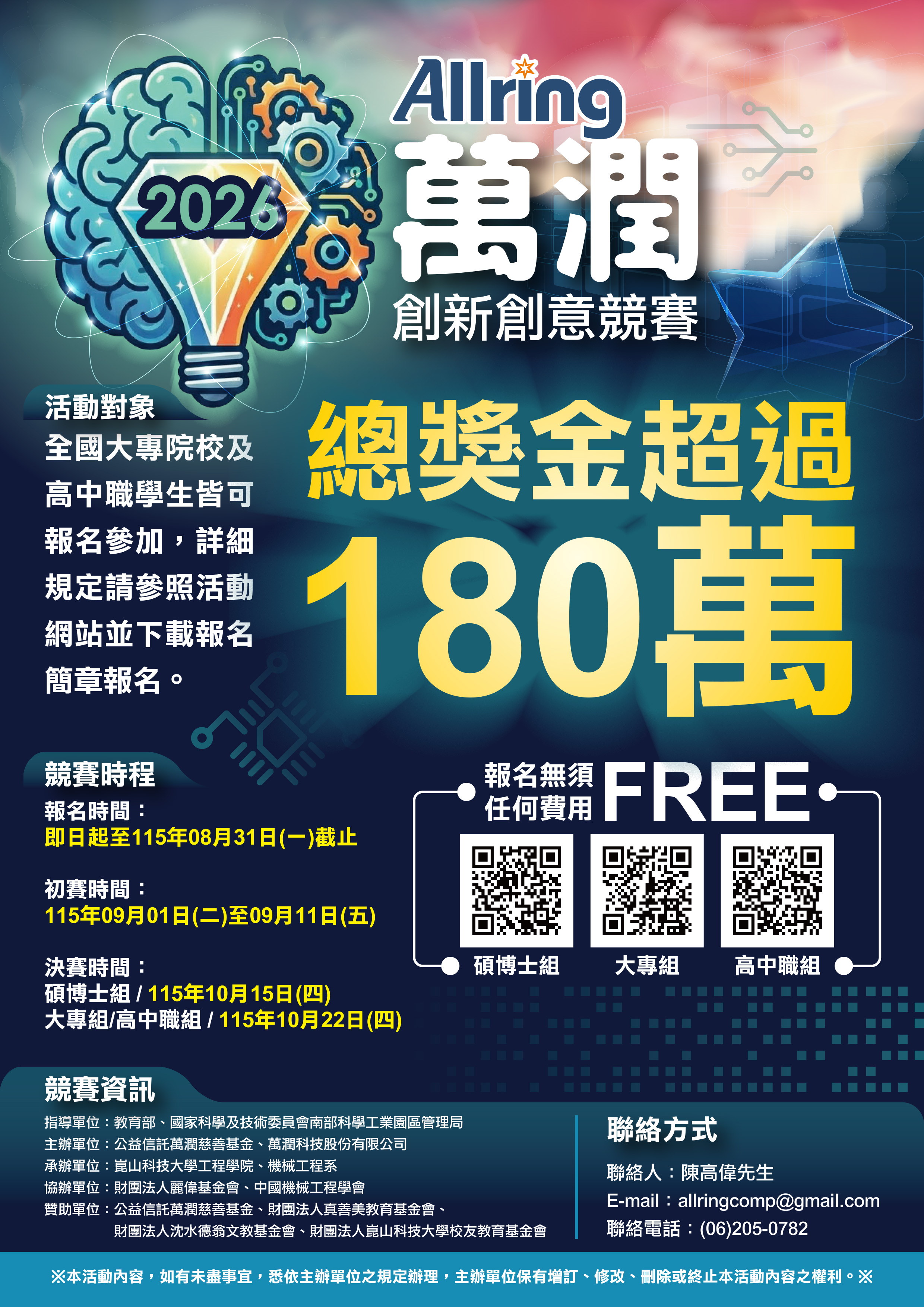 一、活動目的:為提升學生專業及創新能力,激發創造潛能,開發電機資訊、AI智慧系統、工程應用等相關創意應用,透過競賽辦理,經由各式創意發想製作成品參與競賽,提升學生創新創意及專利申請興趣,進而提升國際競爭力。 二、辦理單位:主辦單位:公益信託萬潤慈善基金、萬潤科技股份有限公司;承辦單位:崑山科技大學工程學院、機械工程系;協辦單位:財團法人麗偉基金會、中國機械工程學會。 三、報名時間:即日至115年08月31日止受理報名。 四、報名方式:參賽隊伍必須先至「萬潤2026創新創意競賽-高中組」網站下載競賽簡章:https://web.ksu.edu.tw/DTCE000/page/62042 五、檢送本活動報名簡章和競賽海報各1件。 六、競賽聯絡人:陳高偉先生,電話:(06)272-7175#540、(06)205-0782,電子信箱:allringcomp@gmail.com |