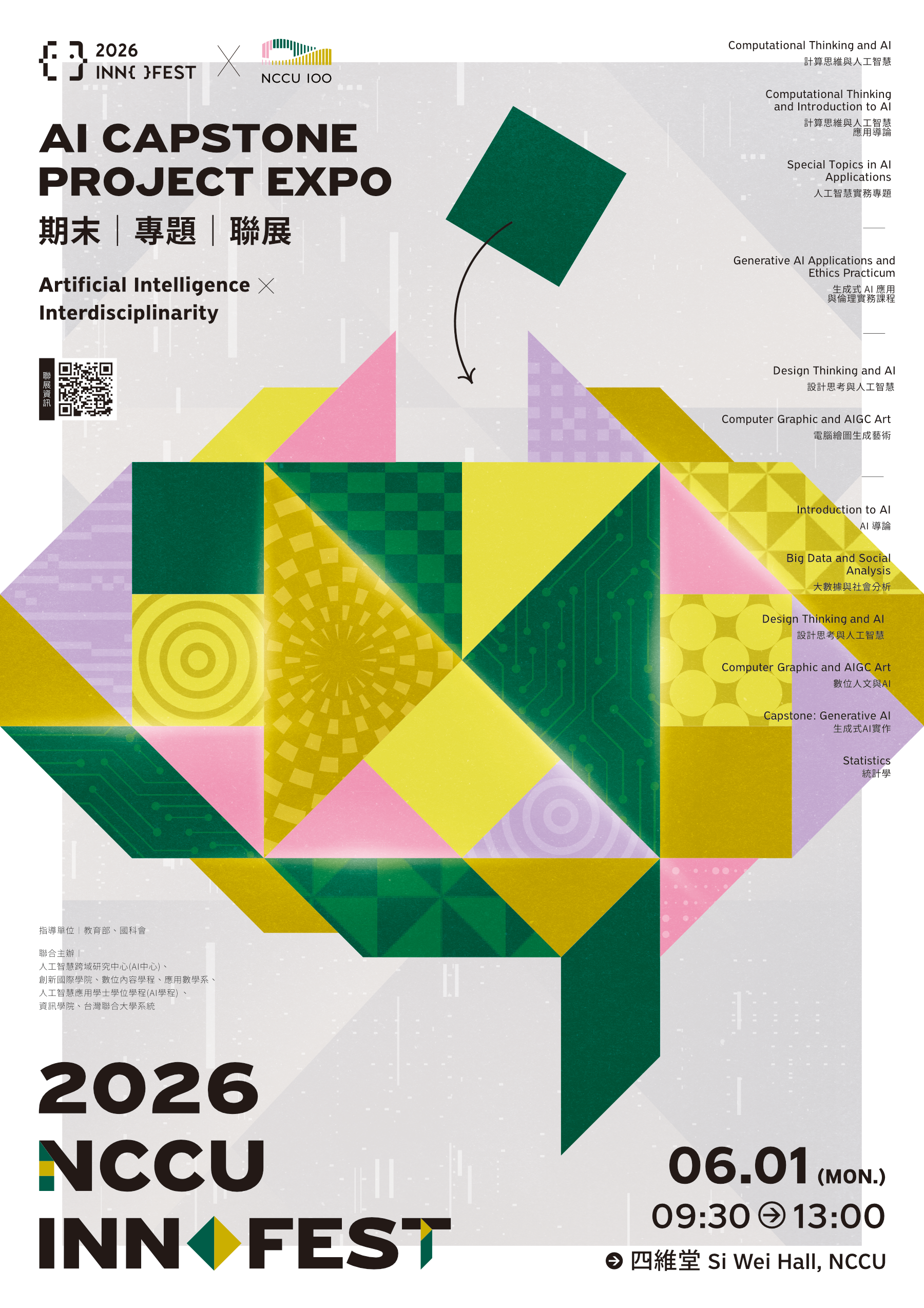 一、為推動人工智慧之跨領域發展與應用,政大人工智慧跨域研究中心(AI中心)將於本(115)年6月1日辦理「2026 NCCU Innofest(114-2學期課程期末海報聯展)」。 二、本次活動預計邀集政大10餘門人工智慧跨域相關課程進行成果展出,並規劃邀請台灣聯合大學系統課程共同參與,打造跨校跨域之成果交流平台。聯展亦將邀請企業到場觀展,期藉由成果交流,促進跨域合作與創新實踐,誠摯歡迎各界人士蒞臨觀展。 三、另為擴大交流效益,誠摯邀請校內外相關單位共同參與:如有意願參與本次聯展之課程或專題團隊,歡迎於4月30日以前與本中心聯繫,以利納入整體展出規劃;另亦歡迎企業或相關機構蒞臨觀展交流,如有團體參訪或合作洽談需求,亦可事先與本中心聯繫安排。 四、聯展資訊:日期:115年6月1日至6月3日。(6月1日9時30分至下午13時為學生現場展示解說,6月1日13時至6月3日12時為靜態海報展);地點:政治大學四維堂。 五、聯展活動介紹網頁:https://iaic.nccu.edu.tw/news/239 六、聯繫方式:政大AI中心,Email:innofest@nccu.edu.tw。 |