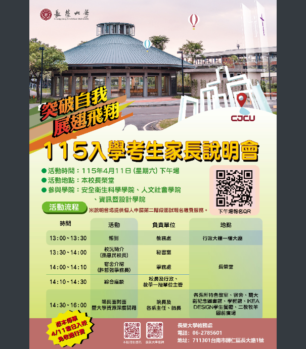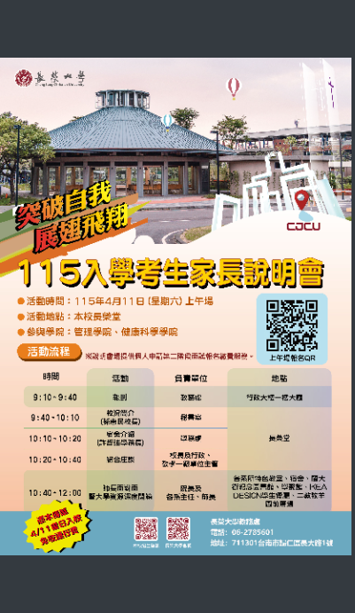 說明: 一、活動目的:為了讓高三學生與家長深入了解本校的優質學習環境並熟悉未來的學習場域,特別舉辦「115入學考生家長說明會」。本活動將開放專業教室與特色空間,並安排校園介紹,幫助學生認識校舍設施。此外,透過「學系面對面」活動,讓考生與家長可清楚掌握各學系的課程規劃與未來學習方向,進而確立個人學習志向,順利銜接職涯發展,提升未來就業競爭力。 二、活動場次:(一)上午場: 1、參與學院:管理學院、健康科學學院。 2、報到時間:上午9時10分至9時40分。 3、活動時間:上午9時40分至中午12時。 4、活動地點:本校長榮堂。 5、更多活動資訊及報名網址:http://cjcu.tw/r/AXGVUz。 (二)下午場: 1、參與學院:安全衛生科學學院、人文社會學院、資訊暨設計學院。 2、報到時間:下午1時至1時30分。 3、活動時間:下午1時30分至4時。 4、活動地點:本校長榮堂。 5、更多活動資訊及報名網址:http://cjcu.tw/r/xeRQbT。 三、報名截止時間:115年4月9日(星期四)。 四、檢附活動海報,懇請各校宣傳推廣。 |