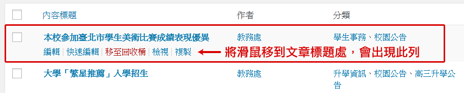 1. 在文章列表中,將游標移到文章標題上,並點擊下方的「快速編輯」。