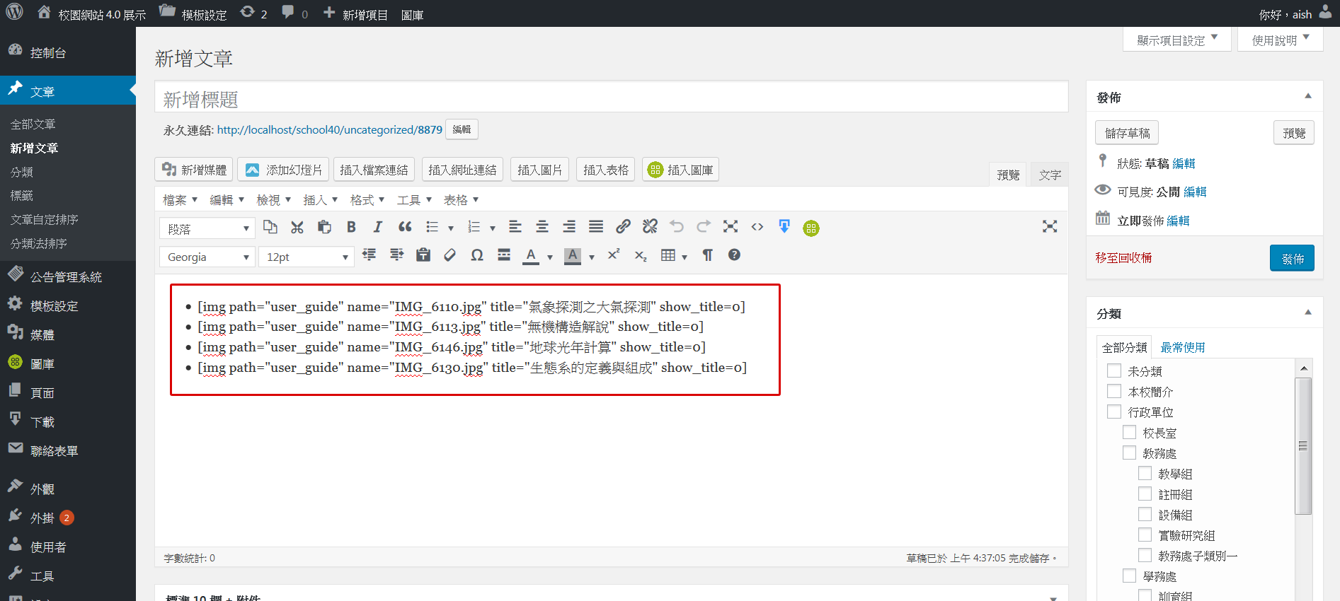 - 點擊「插入至文章」,將圖檔列表插入至文章中。